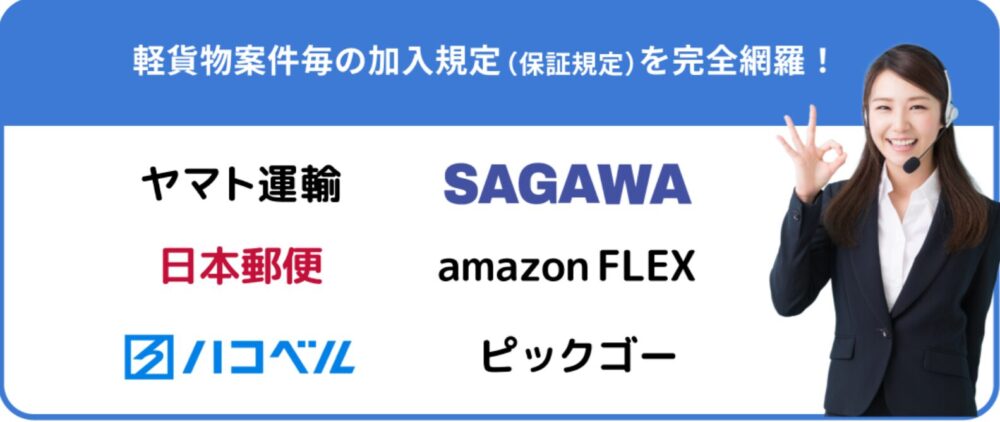 ネット見積りができ、即日加入の可能で、ヤマト運輸、SAGAWA、日本郵便、amazonFLEX、ハコベル、PickGoなど各社の保証規定を完全網羅しているため、保険だけ販売している代理店と違って話が早く、ミスマッチも防げる