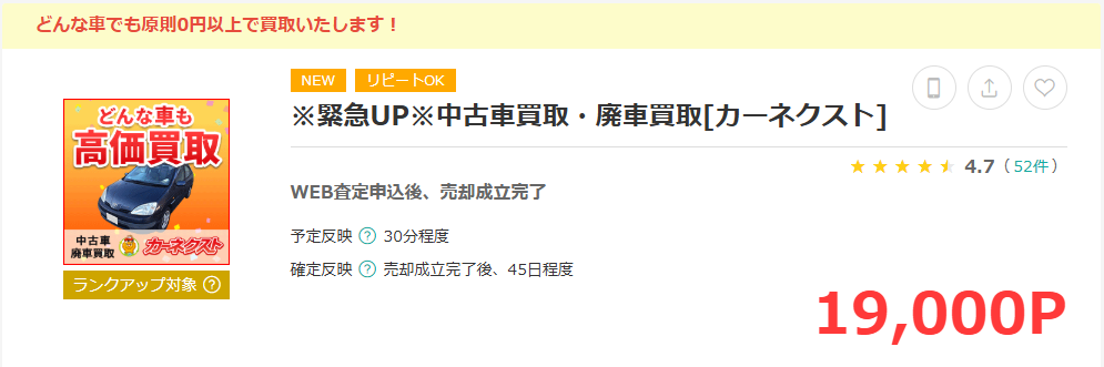 これだと勿体ないのでポイントサイト経由で廃車買い取りサービスに依頼しましょう。