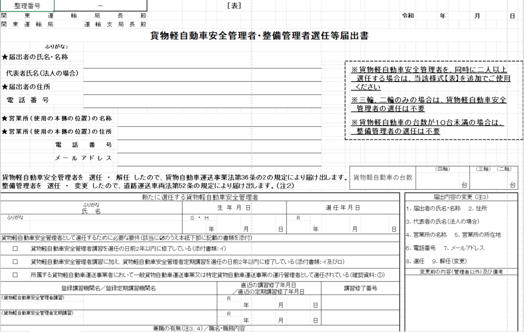 ⇒ 貨物軽自動車安全管理者・整備管理者の選任届出[Excel]