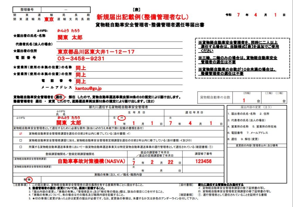 ⇒ 安全管理者・整備管理者の選任届出の新規届出記載例[PDF]